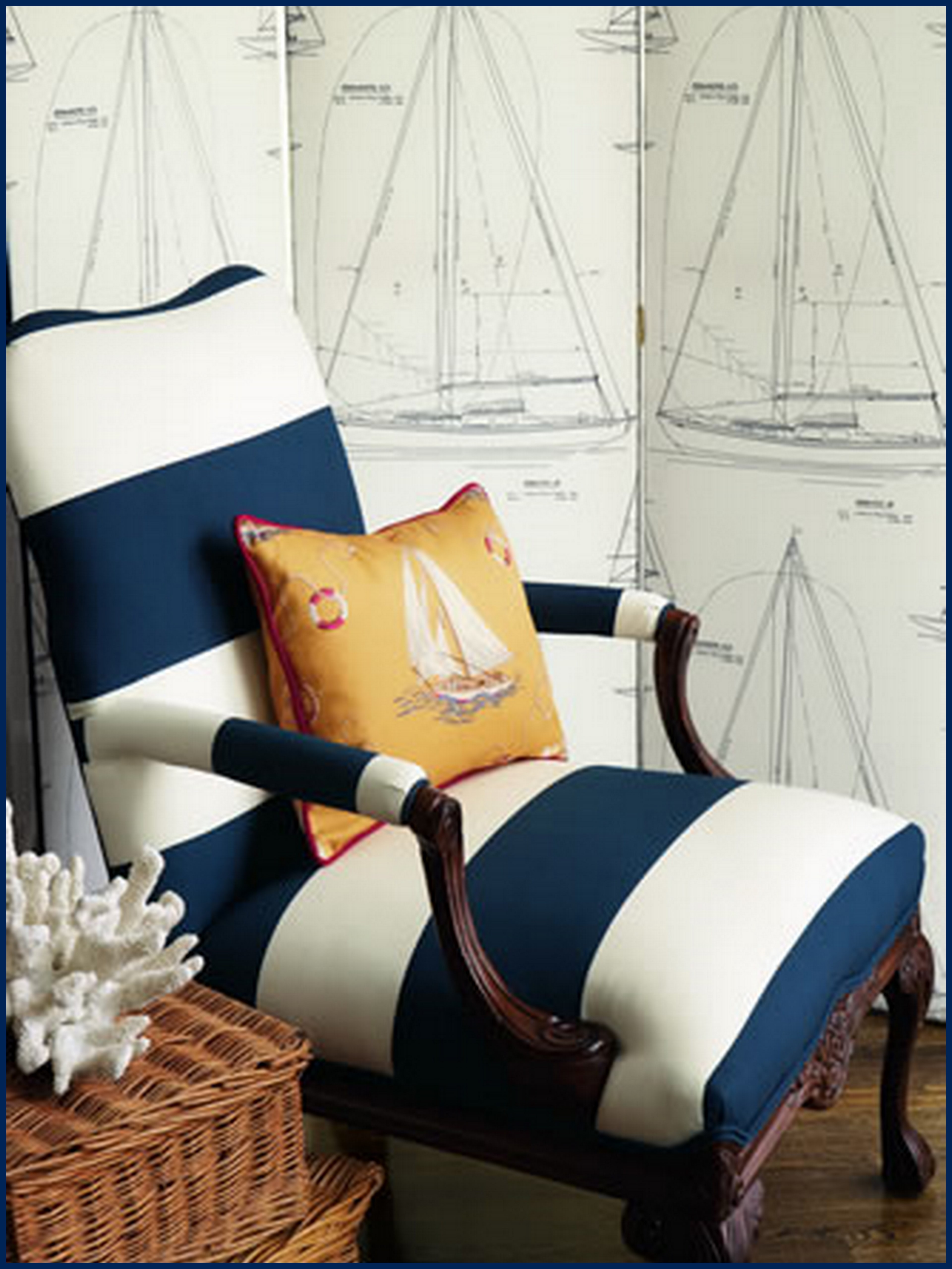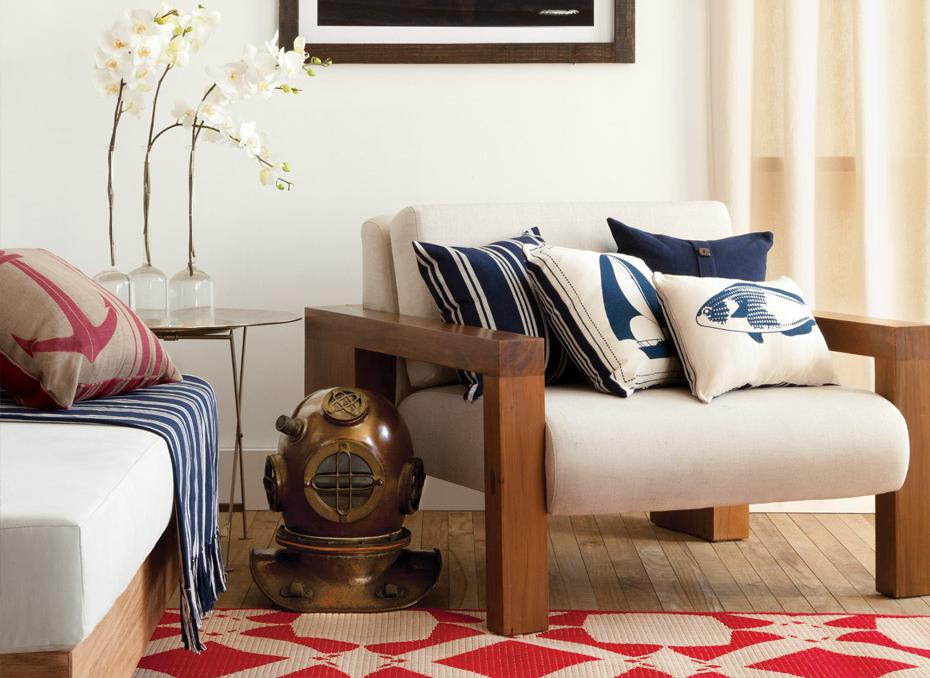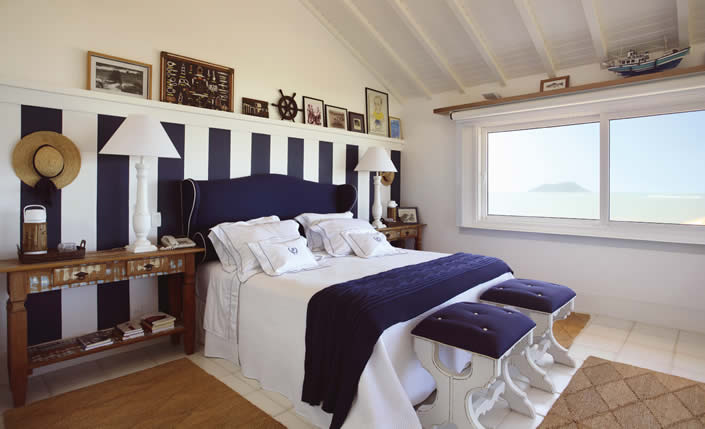 Azul, branco e vermelho são as cores predominantes nesse estilo de decoração. Estampas listradas também fazem parte do pacote. Inspirados nos uniformes náuticos, esses tecidos trazem um clima alegre e descontraído para dentro de casa. E o melhor é que nem precisa muito: usado em detalhes, como almofadas e quadros, ele é capaz de criar um efeito incrível.