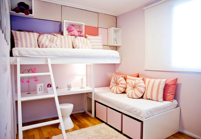 Com o espaço reduzido é importante aproveitar bem parede. Prateleiras e nichos são ótimos para acomodar os pertences das duas e ainda decorar o quarto. A decoração desse ambiente é um pouco mais difícil, mas não tem mistérios. Veja na prática e entenda!